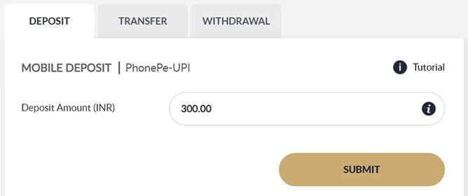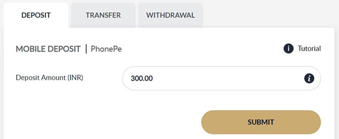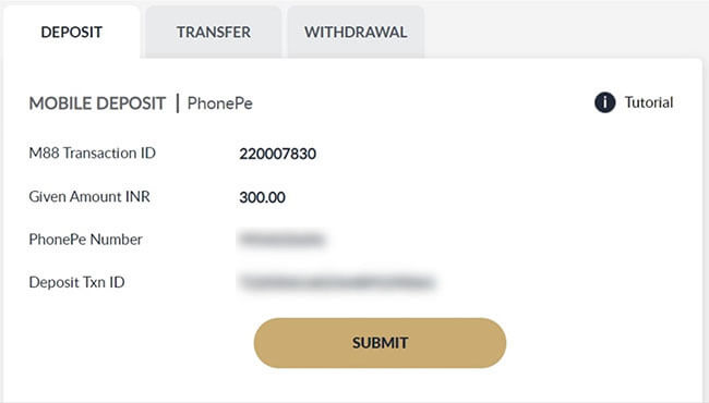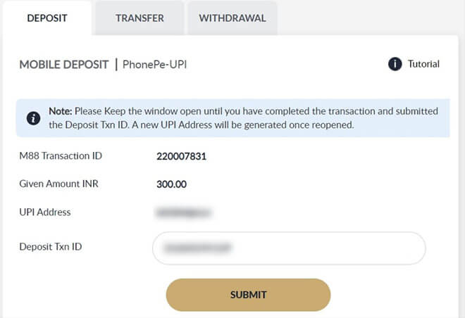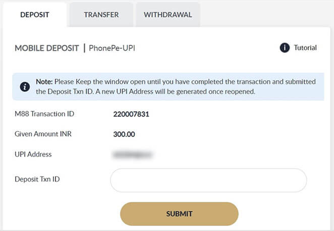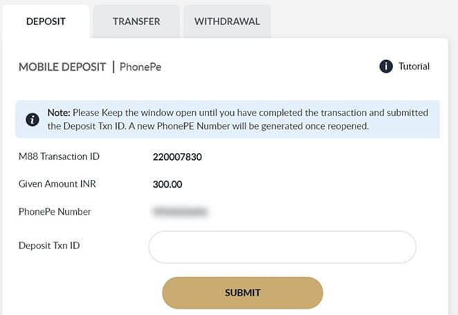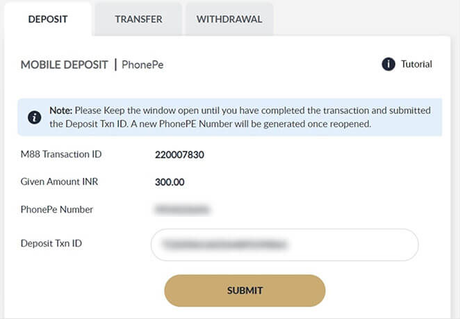 Once you have successfully proccessed the transaction in PhonePe Apps, input the UTR step 3.5 into Deposit Txn ID and Click SUBMIT