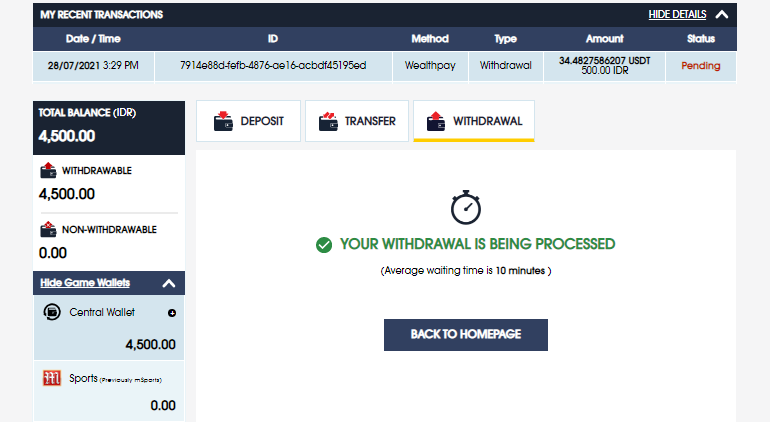 - Withdrawal will be processed within 10 minutes upon submitting